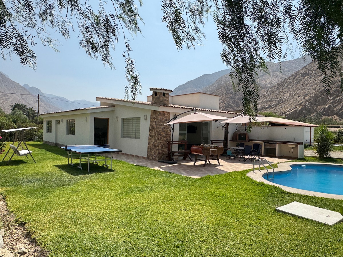 Casa de campo al costado del rio Chillón, a 10 min de Santa Rosa de Quieves, en Lima; con huerto orgánico, piscina, cancha de fulbito, juegos para niños, sala de estar, bar, fogata, cocina campestre y hermosos paisajes. A sólo 2 horas de Lima, una escapada inolvidable.