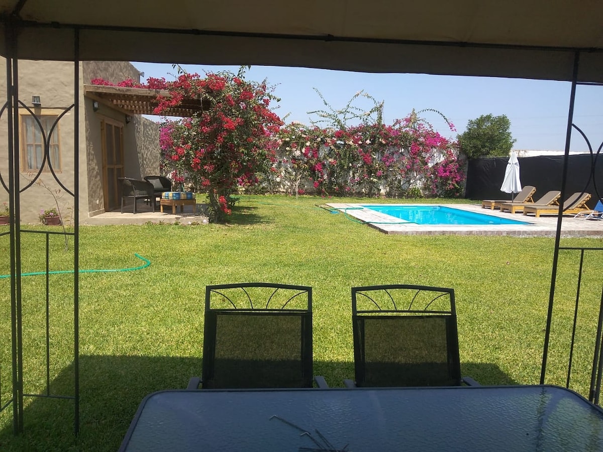 Our cozy little house is located in the El Carmen district, Chincha in the La Romana condominium. 2.5 KM from Hacienda SAN JOSÉ (6 minutes) We have sun all year round. The Casita has 2 comfortable bedrooms for 7 people, a large kitchenette and a living room with a beautiful fireplace and decor. 2 full bathrooms with hot water. Large gardens, 6x3x1.40 swimming pool, sun loungers and parasols. Grill area and Chinese box. Hammock toad swings Jumping full green areas We are PET friendly!