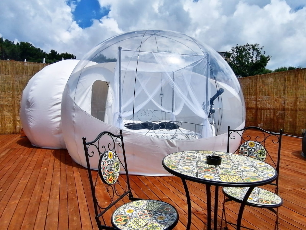 Have you ever slept under the stars? Immersed in the heart of Sicily, discover the thrill of spending a night under the stars with the person you love inside a transparent bubble and when you wake up, enjoy a typical Sicilian breakfast. Thanks to an outdoor heated hot tub always at your disposal, experience a unique moment, in silence, spending a stay away from the chaos of the city without having to give up comfort. Breathe and be inspired. Start your dream.