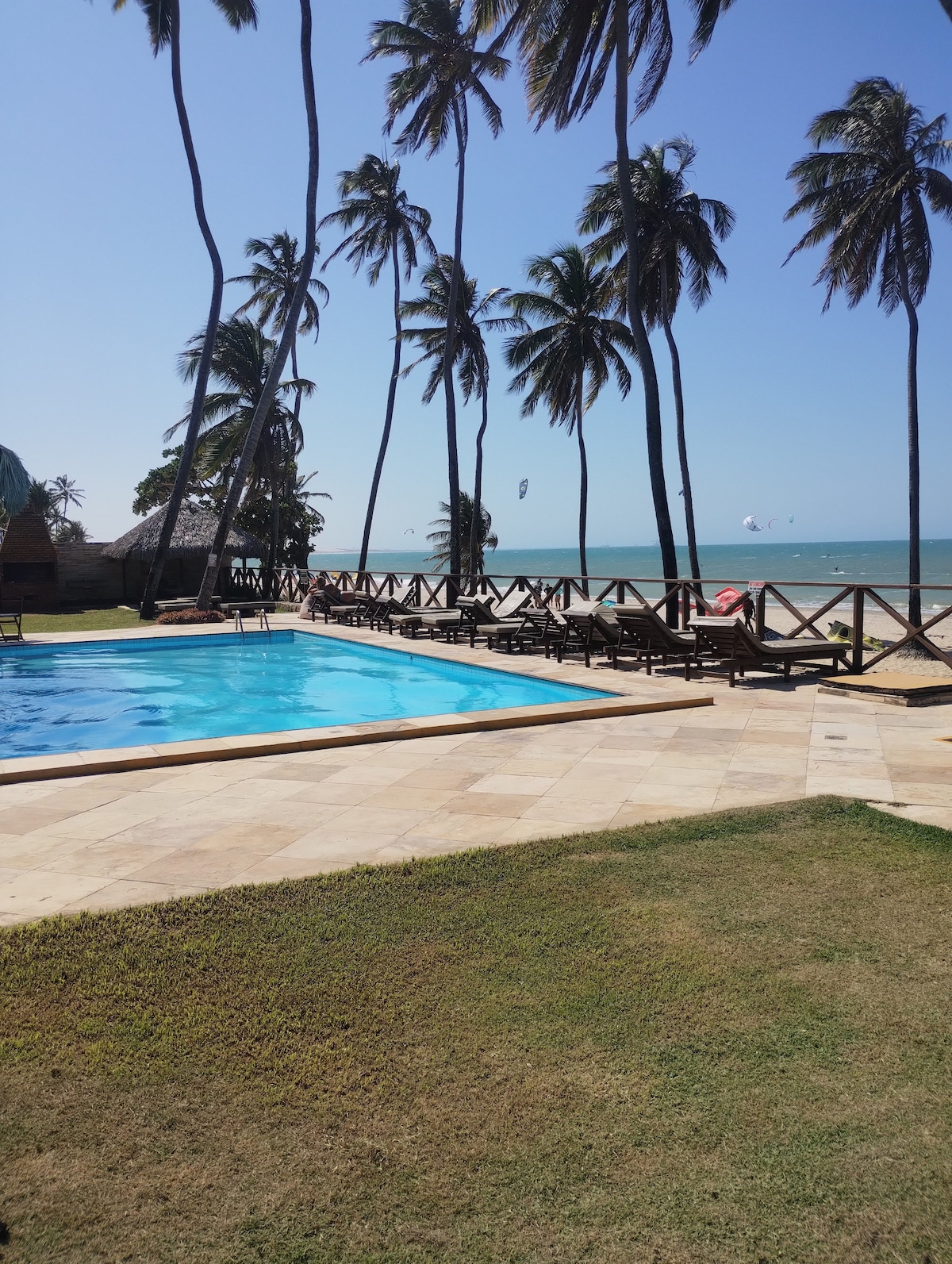 2bdr apartment on the beach, with beautiful ocean view. Wake up to the sound of the waves, have breakfast facing the ocean. You can directly access the beach, and go swim, walk or kite right in front. The kite school is right next door. You are 2 minutes walk from the center of Cumbuco, with its restaurants, bars and shops • 2 bdr, 2 bathrooms and 2 toilets • Private terrace, sea view • Huge swimming pool facing the beach • Equipped kitchen • Complementary underground parking, 24-hour security