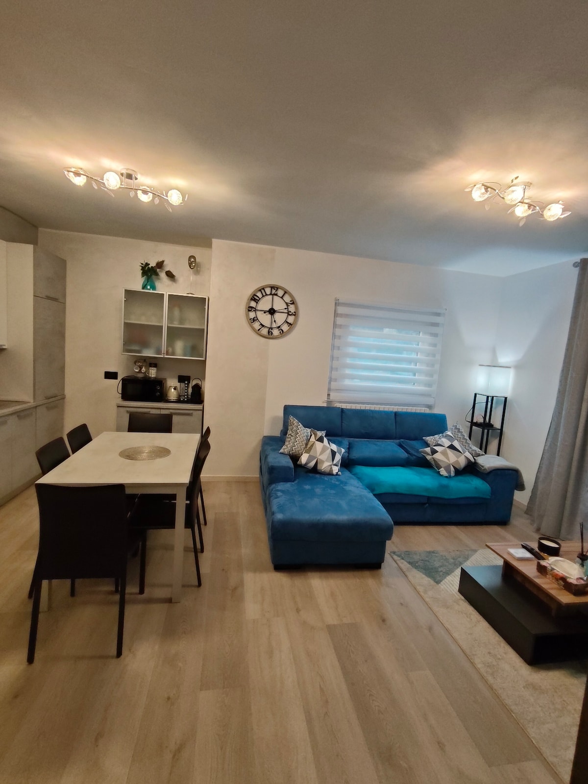 Large studio apartment with independent entrance and parking space. It consists of a living area with a fully equipped kitchen and a pellet stove. In addition, there is a sleeping area with a double bed + sofa bed, a wardrobe and a TV. There is also a large storage room and a bathroom with a washing machine and a bathtub with a shower (electric boiler for hot water). The studio apartment is located in a quiet area within walking distance of the center with restaurants, pharmacy, post office, bank and other leisure areas.