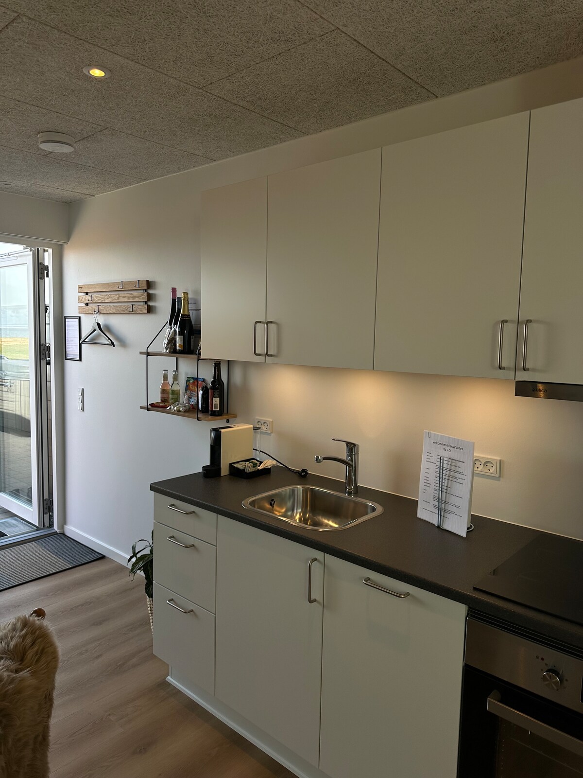 Enjoy a stay close to nature – without compromising on comfort. Here you get a good bed with soft duvets and pillows, a modern kitchen and bathroom, and your own heated outdoor spa under the open sky. The apartment is located at Hølken Strand on the Jutland east coast with panoramic views of Kattegat to Samsø and Tunø. Through the skylight window above the bed, you can fall asleep under the stars and wake up to the sound of the waves. Located between Aarhus and Horsens.