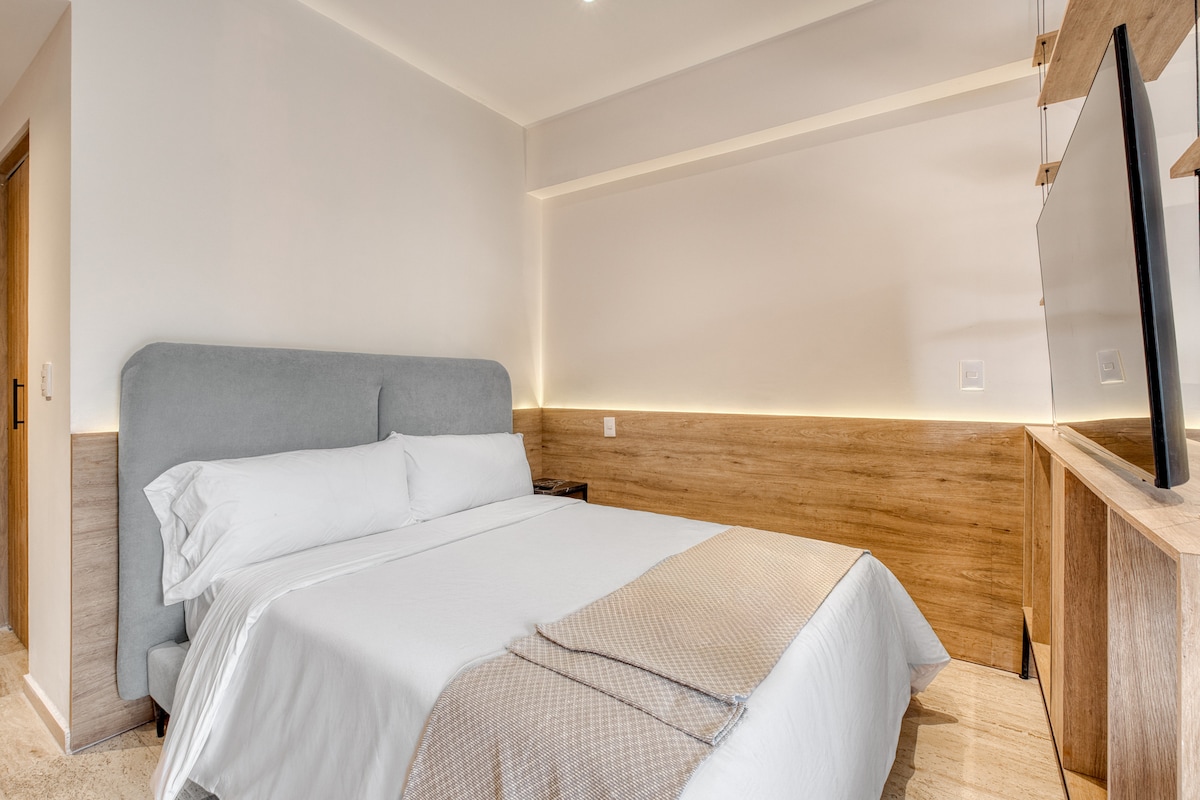 Departamento privado en edificio con vigilancia las 24/7. Preparado para 2 personas, puede recibir hasta 3. Cocina completa, utensilios, horno, microondas, etc. WiFi de alta velocidad de doble banda. Cama Queen Size muy confortable, mesa para trabajo. El rooftop es un área común, espaciosa y magnífica para estar, trabajar, hacer ejercicio, etc. El grill/parrilla/asador es de pago por limpieza. *Antes de reservar, recuerda, el check in es a las 4 pm del día de reserva*