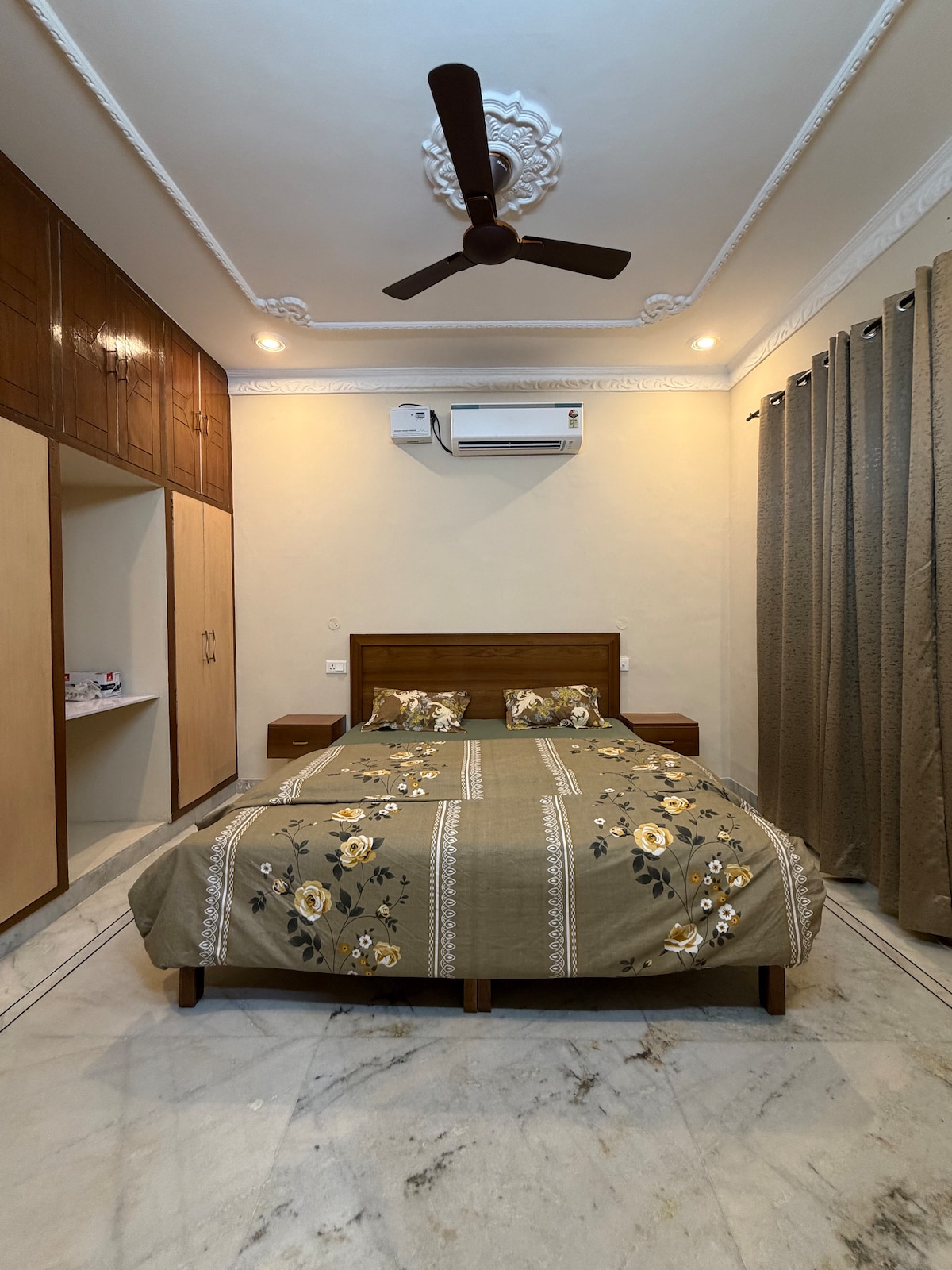 Relax in an independent first floor in a house that offers two ac bedrooms/two washrooms/ one kitchen/ one ac hall, while enjoying your favourite tv shows in a huge screen available in the peaceful and private living area, by also preparing your meals in the personal kitchen equipped with a fridge, 4 burner gas stove, water ro and utensils, tea and sugar are available. Unmarried couples are also welcome. Self check-in. No time restrictions! One cosy balcony sitting, all private, no interference!