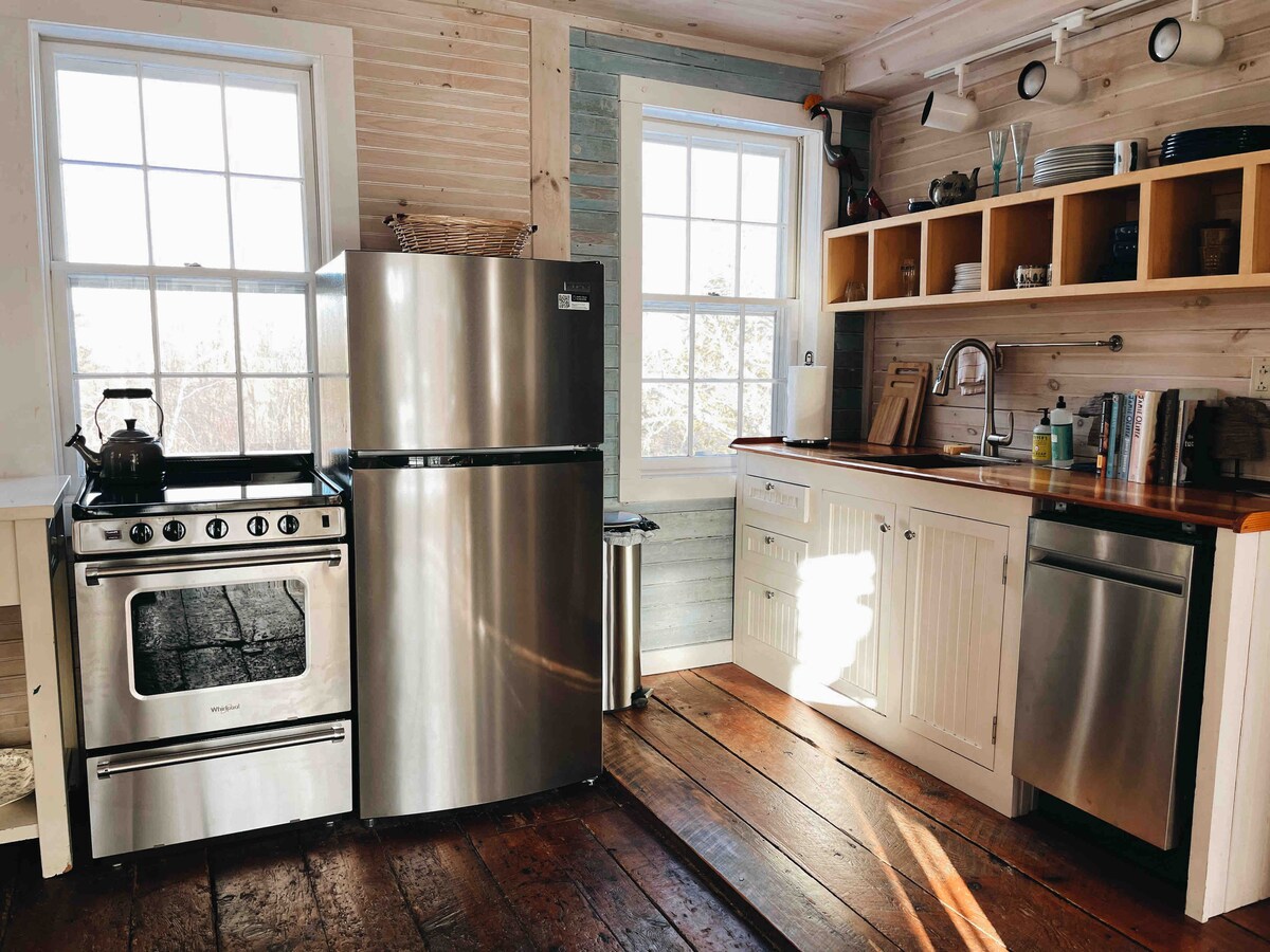 Completely renovated in 2024! Located at the end of a quarter mile driveway on a 60 acre oasis in the heart of Shelburne, the Barn has ski on ski off access to a groomed private cross country trail network, a swimming pond, views of the Adirondacks & Green Mtns and is 100% powered by solar energy. The Barn has a completely renovated kitchen, two bedrooms, two bathrooms, brand new queen & king mattresses, and a pull out couch (perfect for kids) We live next door & look forward to hosting you!