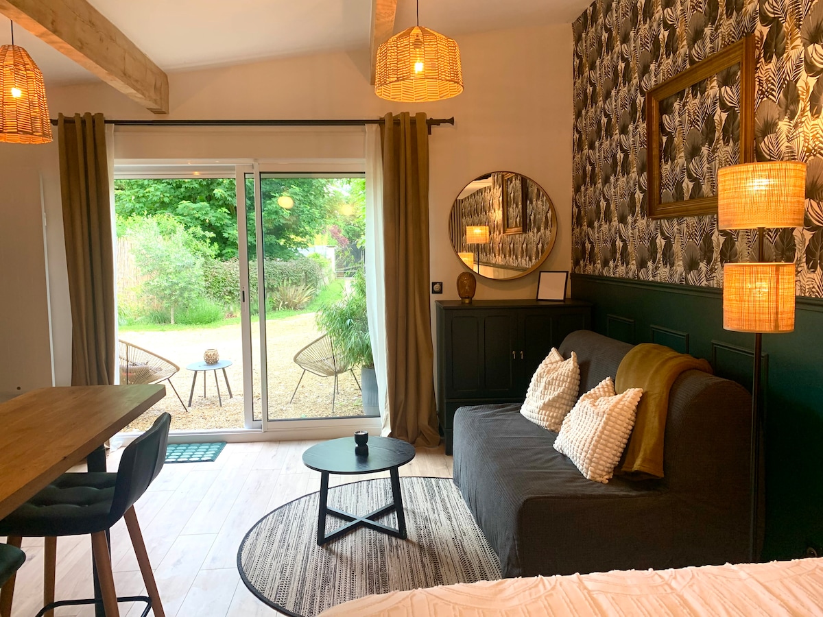 Petit patio extérieur avec table et chaises 1 Chambre lit double 140, grande douche, lavabo, penderie Salle de bains dans la chambre Possibilité de coucher un couple ou enfants sur un canapé convertible. LIT bébé, chaise haute enfant possible mais demander à l'avance. WC séparés dans l'entrée Cuisine : plaques vitro-céramiques, Four, micro onde, bouilloire, cafetière Senséo, cafetière à filtres ,Combiné réfrigérateur congélateur, table et chaises