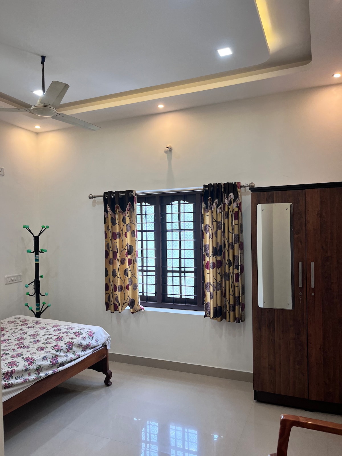 Nikhil Gardens- A Homestay in Varkala # 2 BHK Homestay # 2 Seperate Bedrooms with attached bathroom # Two Air-conditioned rooms # Fully furnished # Hot Water # 2 Mins Walk to Varkala Beach # Front & Back Garden View # Kitchen with gas & basic cooking amentities # Hi speed Wi-Fi Internet # Car & Bike for Rent # Laundry on Request # Sightseeing and Airport pick up/Drop( On request) # If the Entire villa is booked for 2 persons, Only one Ac room will be provided. # Living Room Ac needs extra pay.