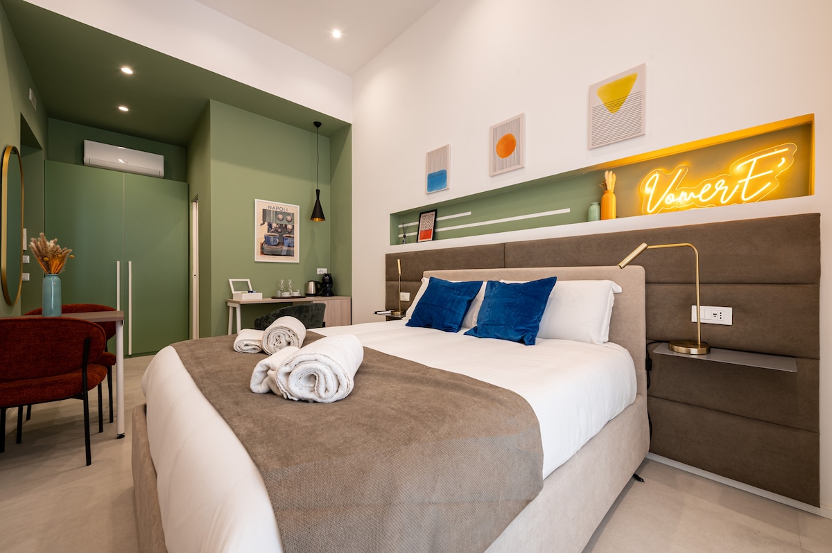 A cozy room with authentic character, embellished with an original tufa wall that tells the story of Naples. Located a short walk from the Toledo stop, it is the ideal choice for those seeking a comfortable and charming stay in the heart of the city. The room has a double bed, private bathroom, air conditioning, fast Wi-Fi and TV. Every detail is designed to offer comfort, in an atmosphere that combines tradition and simplicity.