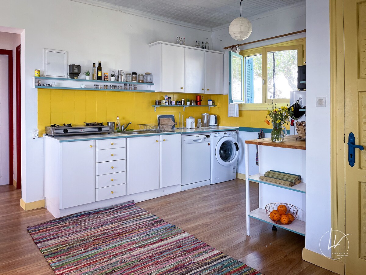 This house is a tribute to our dearest mother Ioanna who was born in this village and her wish was a house by the sea she so adored. It's our family getaway, our childhood paradise of joy,swimming and daydreaming. We are happy to host guests and families who love nature, sea and peace. Enjoy its special vibe and location, amazing sea view, peaceful surrounding with no direct neighboors. Nested in a private 2hectares olive grove, 20metres from a peaceful beach, 5' walk from the market&taverns.