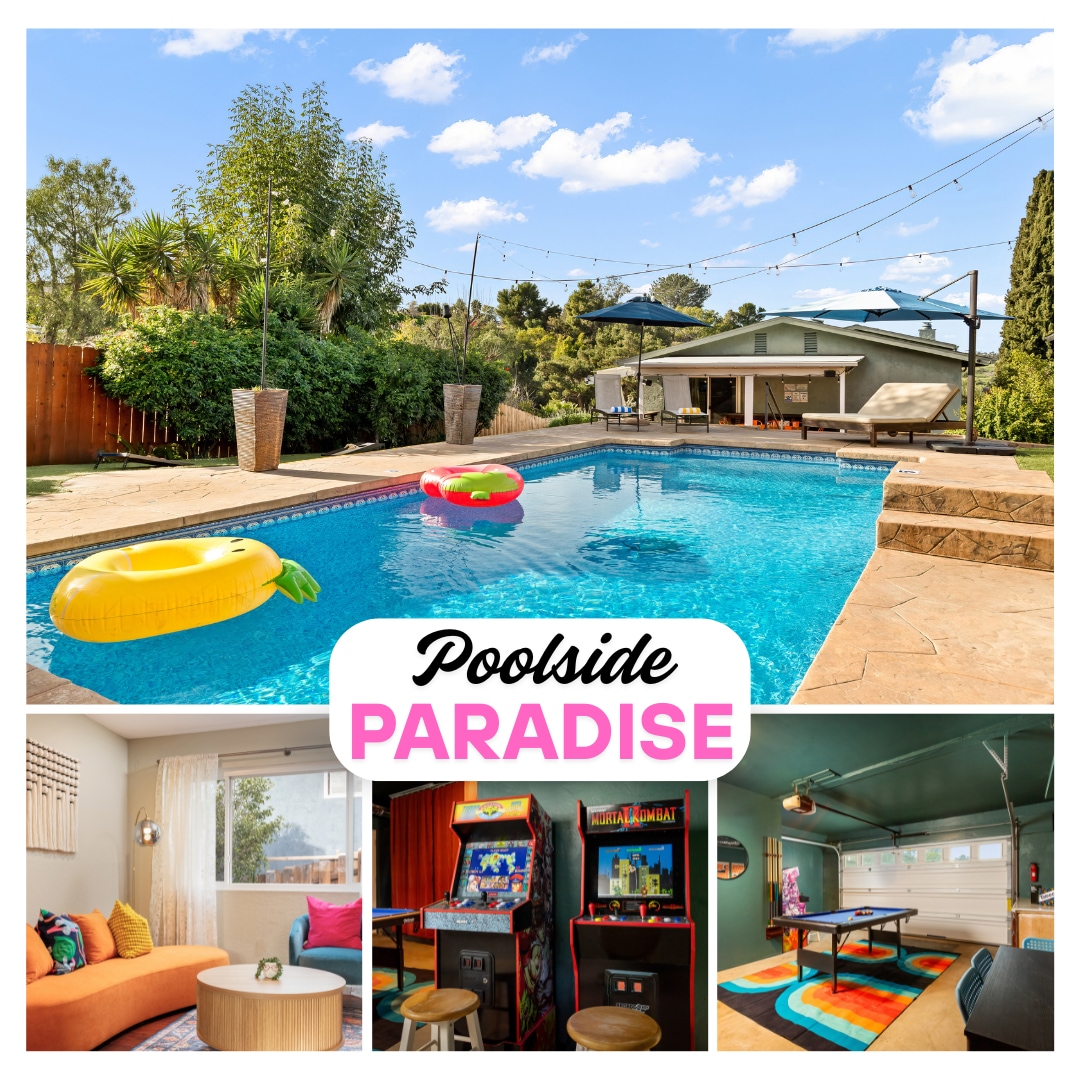 Beautiful family vacation retreat! Amazing backyard includes your own private heated pool, a spacious deck for relaxing with lounge chairs, dining spaces, and fire table. Fenced for privacy. Inside enjoy the game room and arcade, smart TVs located throughout the house, and air conditioning. Strong Wi-Fi signal, including the outdoor deck area. Amazing location close to all SD has to offer: within 20 minutes of the zoo, beaches, Sea World, downtown, and the airport! Private parking.