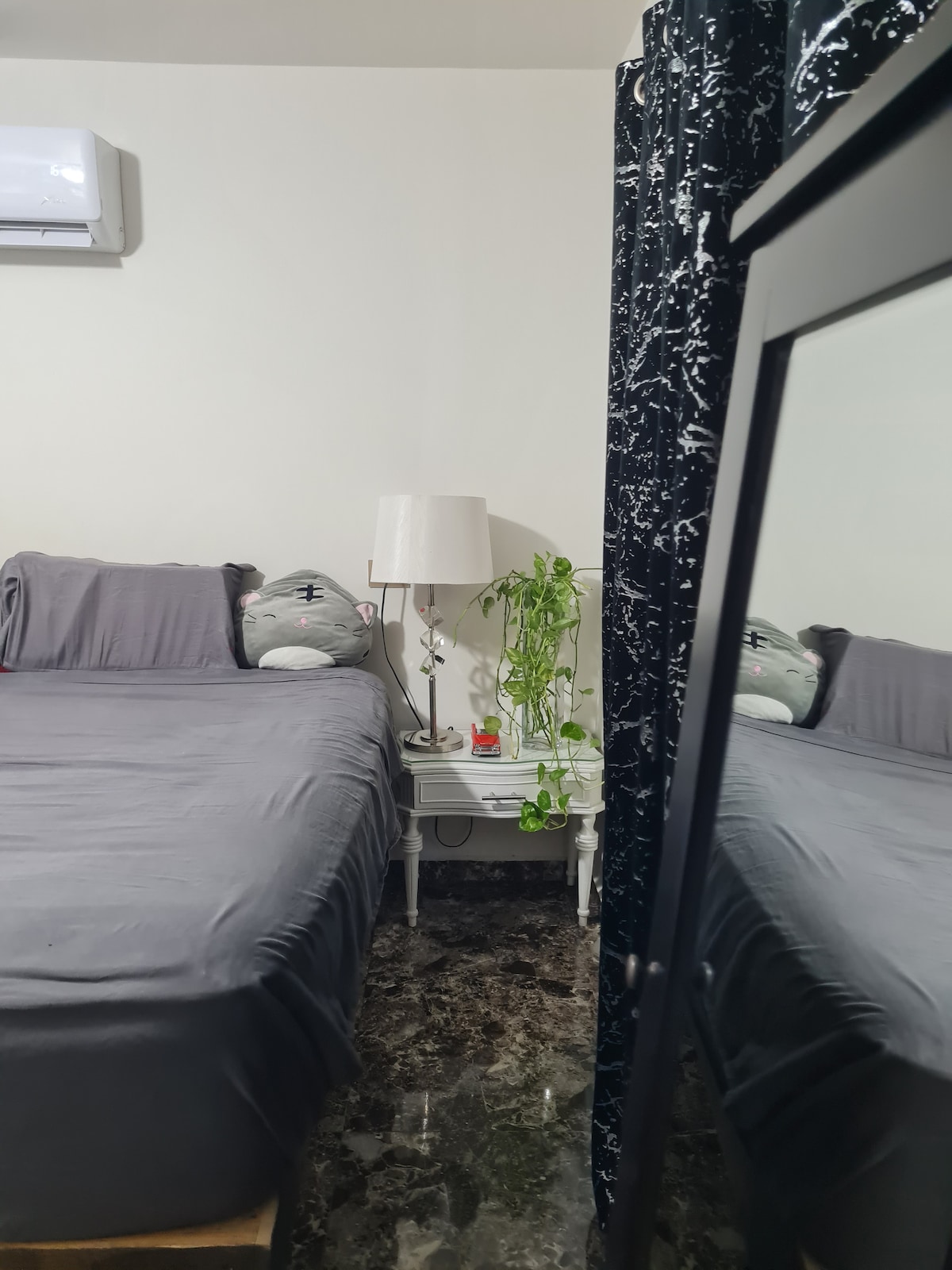 The apartment is decorated with new furniture, a contemporary style, the layout consists of seeking a balance, therefore the intention is to seek relaxation with neutral and light colors such as sky blue and white that harmonize. Because it is a studio, you will find how the work area desk with its lamp where you can spread creativity, the entertainment area 58-inch 4K smart TV with NETFLIX converge. And the sleeping area. All in one fusion.