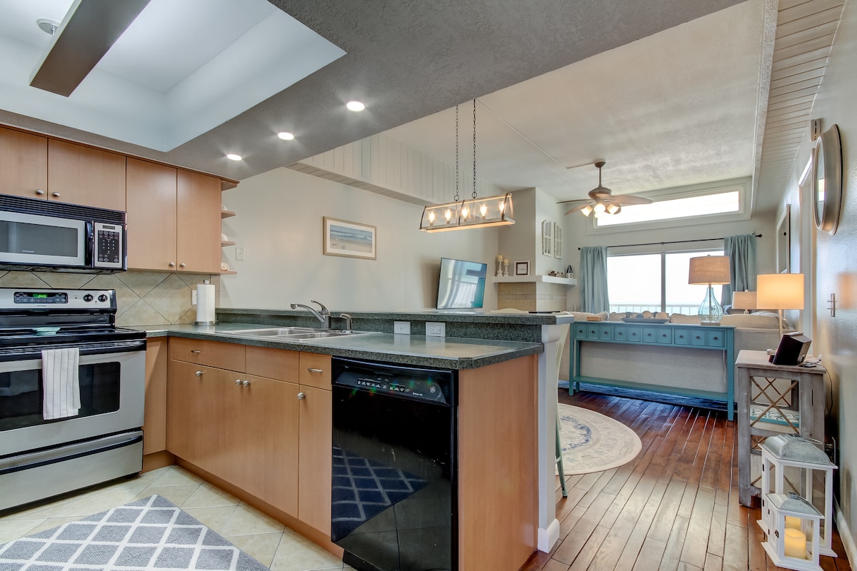 This upper floor, 3-bedroom modern chic condo hotel suite offers sweeping views of the Gulf of Mexico from private balconies. While preparing your morning coffee on the spacious kitchen island, you can see the shrimp trawlers making their way out to sea. Enjoy a cocktail while watching the sunset over the open water of the Gulf of Mexico. This suite can sleep 8, with King or Queen-size beds in each of the three bedrooms, a comfortable full-sized sofa bed in the living room & 3-1/2 bathrooms.
