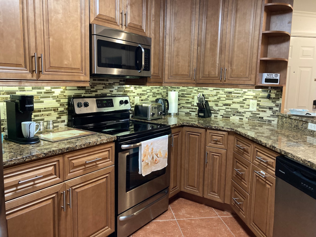 Fresh and Clean, this corner ground floor unit offers you privacy with all the amenities. Secured High Speed WIFI and landline phone in the unit. Ceramic tile throughout. Fully equipped kitchen and dining room. One bedroom with king bed and a living room with queen sleeper sofa. Towels, beach towels, beach chairs, beach umbrella, coolers, all the amenities at a reasonable price. This beautiful condo is located in a resort style complex with heated pool, clubhouse, and 24 hr fitness center.