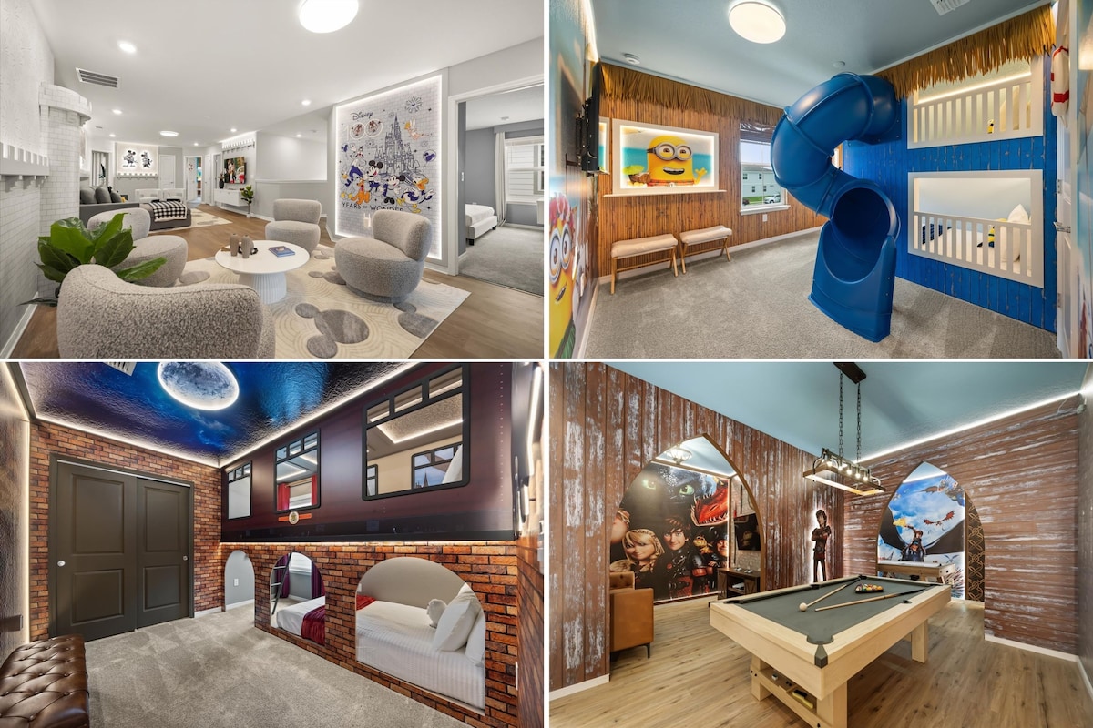 Bring the whole family to this 8 bedroom, 6 bathroom home with plenty of room for fun. Luxurious furnishings, theme rooms, large patio area, private pool/spa, a game room and incredible resort amenities will provide everything you need for the ultimate family vacation! 4 King bedrooms (3 with private ensuite bathroom), 4 themed bedrooms, and a cozy nursery area! Adult lounge with 98" TV and bar area. First floor game room with pool table, air hockey, apple gaming and a classic gaming console.