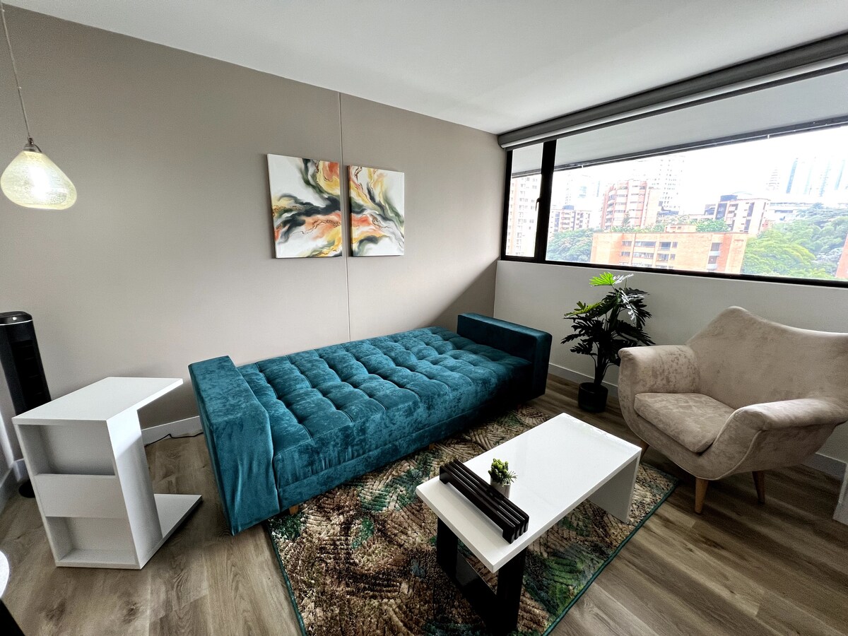Modern automated apartment with separate bedroom, living room and kitchen, fully furnished, 200 MB internet, air conditioning and spectacular city view. The building is located in the best neighborhood of Medellín, El Poblado, near EAFIT University, the Golden Mile, shopping malls, supermarkets, restaurants and the Aguacatala metro station. It has a coworking area, a cafeteria, a gym, and 24-hour surveillance.