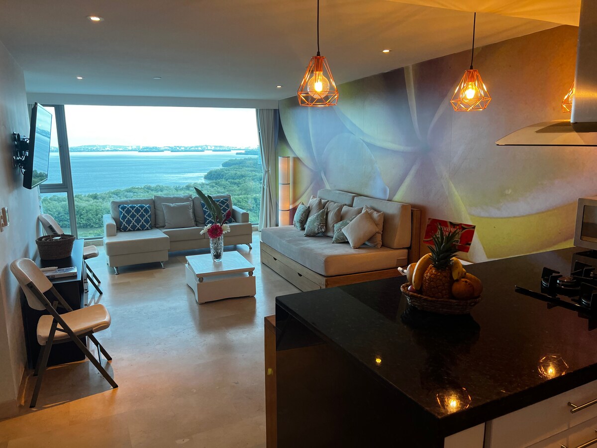 Awesome condo at The Beach Radisson Resort Residences, extraordinary views of the Cienaga, beach and the city; direct hotel beach access to the nicest beaches of Cartagena. 5 minutes to the airport and 10 minutes to the Old city (Wall City) by car . Guest have access to all the Resort amenities like gym, multiple pools, bars, restaurants, spa, sky jacuzzis, wifi, A/C, BBQ areas, 24/7 front desk, security, bellman, room service, etc. Just registered guests are allowed in the apartment