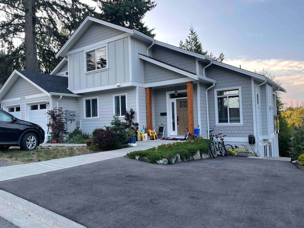 Enjoy ocean, mountain, and city views as well as spectacular sunrises in our beautiful newly renovated suite. Suite is very quiet and has gas fireplace, ambient lighting, rain shower, heated floors in bathroom, large flat screen TV, high end appliances, gas BBQ, & an outdoor sitting area all at your disposal. Located at the end of a quiet cul-de-sac but close to swim lakes, hiking paths, golf courses, beaches, Costco, grocery stores, bakeries, restaurants, and lots more; 3-8 minutes away by car.