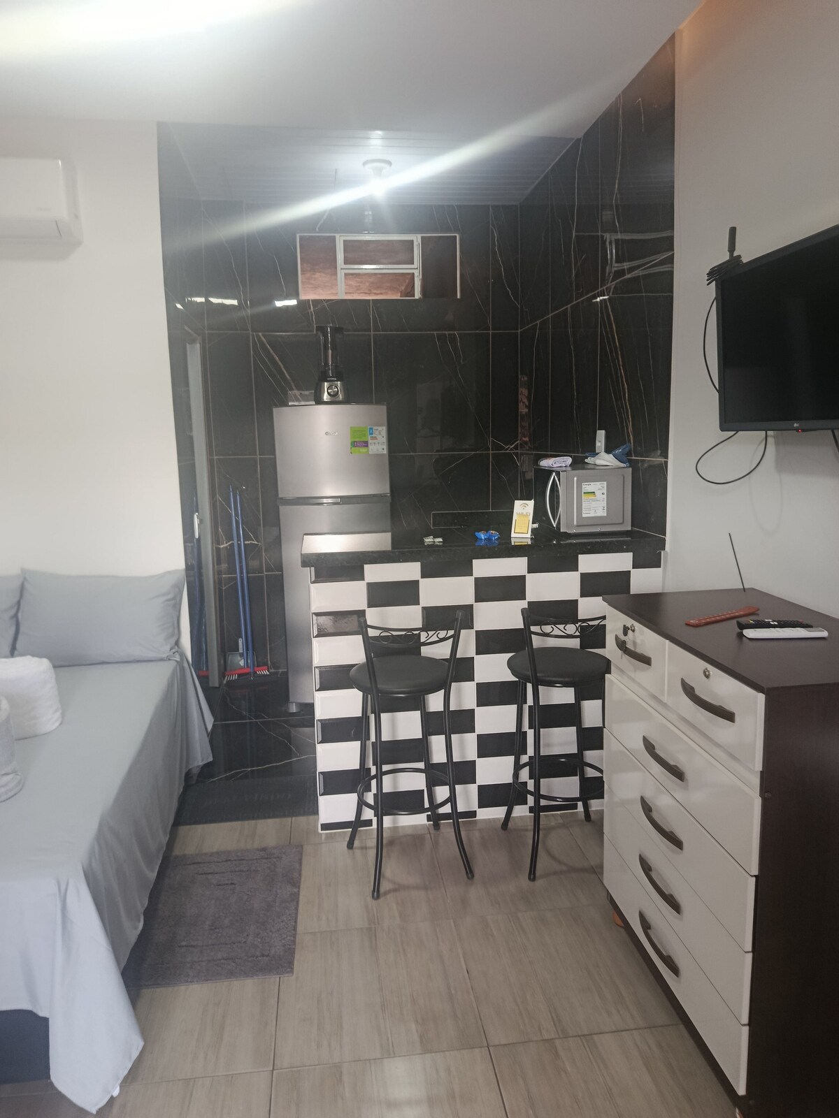 kitnet compacta , moderna, confortável e completa, entrada exclusiva com acesso direto pela rua, privacidade total, geladeira, fogão, microondas, liquidificador, cozinha completa com vasilhas, podendo cozinhar se necessário, ar condicionado, roupas de cama e toalhas, efetuado higienização completa com troca de roupas de cama e toalhas após troca de todos hóspedes, ambiente limpo e cheiroso, para lhe proporcionar mais conforto e tranquilidade.