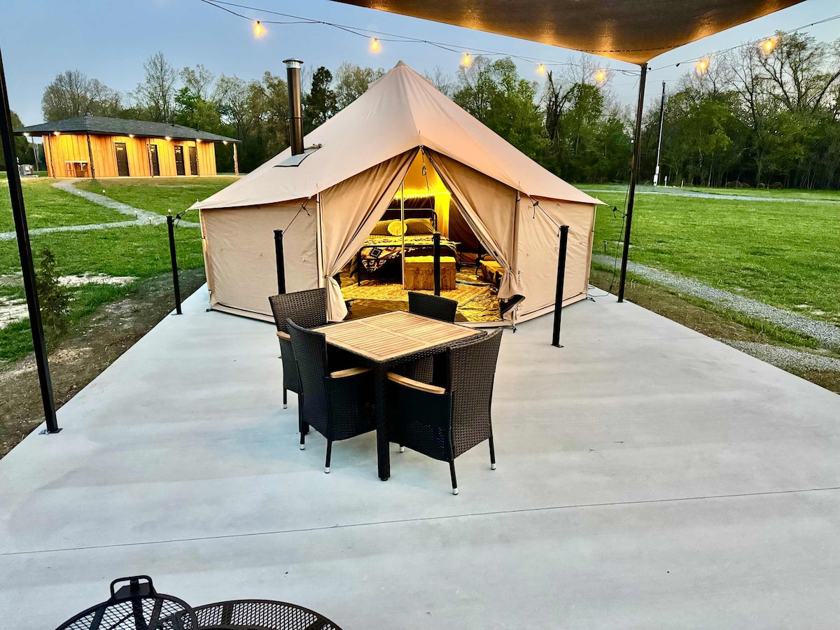 Glamping on the Illinois River near Tahlequah, OK! Glampsites include an 18 foot canvas bell tent on a concrete slab with a queen bed and bunkbed cot. Each site comes with a private full Bathroom in the bath house! Also included is an air conditioner, wood stove, mini fridge, fire pit, and patio table and chairs. The River Bluff Cabins is a beautiful, gated property with river views and river access. The property features two cabins that each sleep 8, 4 Glamping sites that sleep 4, and 6 RV site