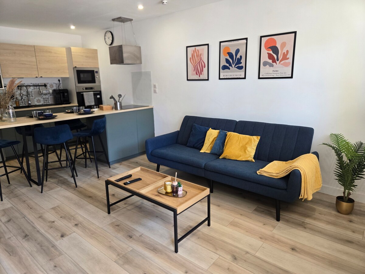 Relax in this quiet and stylish accommodation. Modern two-room apartment in a recent building with a bedroom, a double bed, a desk, a living room, an open kitchen, bathroom with toilet and washing machine The kitchen is fully equipped (fridge, microwave, hob, hood, oven, dishwasher and toaster. A coffee and tea bar area. The living room features a 2-seater leather sofa bed, TV, Netflix and high-speed Wi-Fi. Free parking. Access to all amenities on foot