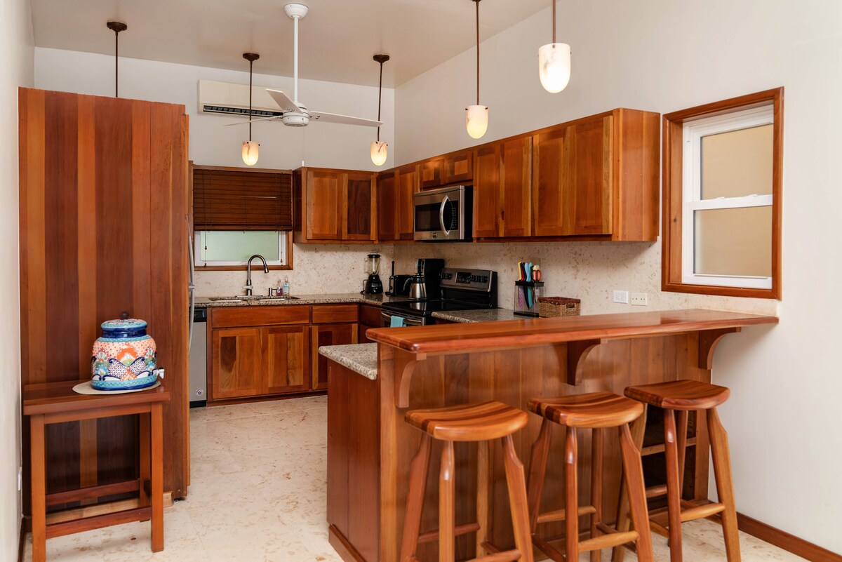 This first floor unit has 9' ceilings, exposed wood beams, full kitchen and a covered veranda with a spectacular view of the ocean, beach, pool and bar! We have four star resort towels, linens, quiet AC and mattresses that guests rave about! Just a ten minute walk to downtown! Relax in the pool or enjoy a cocktail outside by the palapa. Most resorts need a golf cart to get around; optional here! Ocean view, beach front & walk downtown "location, location, location" this is The Palapa House!