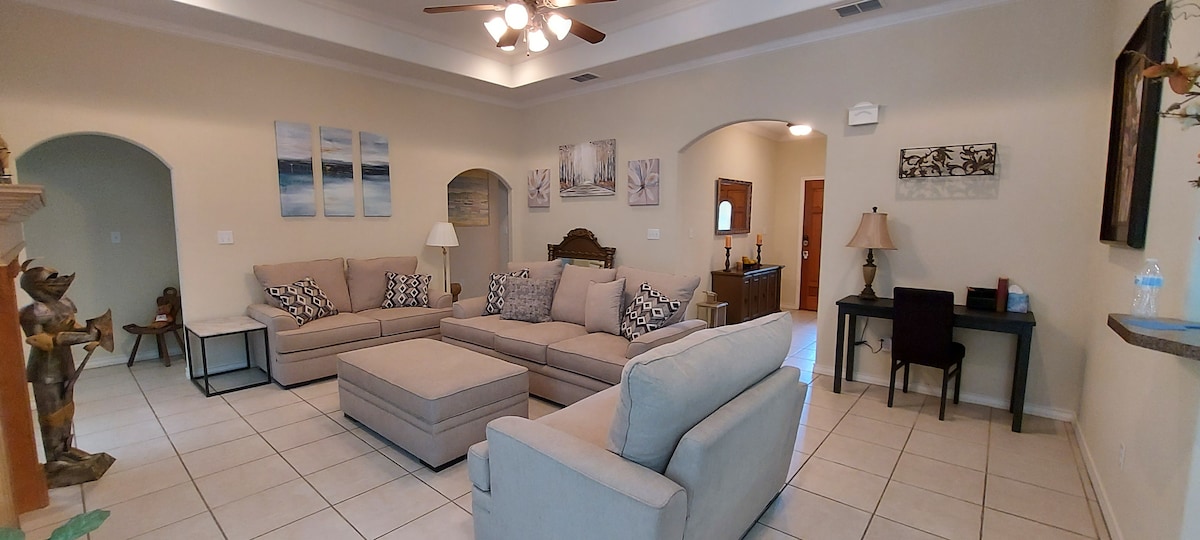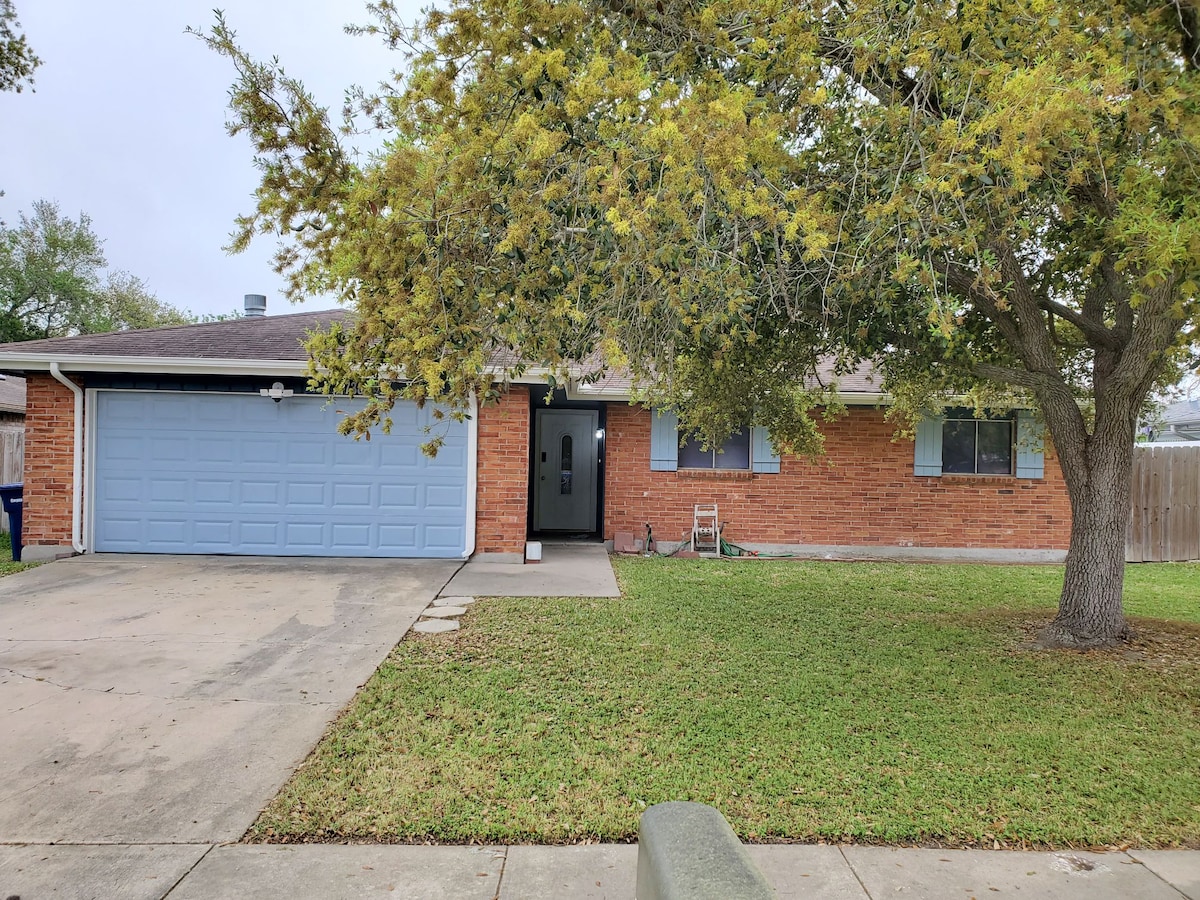 This is a gorgeous, newly remodeled, spacious home stocked full with amenities. It is in an ideal location, in close proximity to the best that Corpus Christi has to offer: 10 minutes to Padre Island beach, 2.2 miles to Texas A&M CC University, Bay Area Hospital, 15 min. to Downtown, and more! Kick back and relax in over 2500 sq. ft. of living or spend time BBQing outside overlooking our former golf course. Great home for large groups, entertaining, and relaxing!