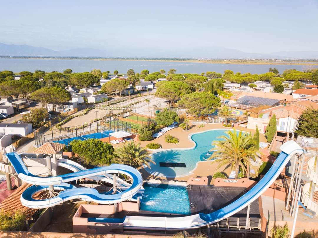 Ce camping de haute qualité est idéalement situé (plage, étang, commerces, centre de thalasso) comporte boulangerie, supérette, restaurants, coiffeur,docteur.Vue sur l’étang avec ses flamants roses et sur le mont Canigou,à 30 mn de l’Espagne,10 mn de la gare,de l’aéroport de Perpignan.De nombreuses activités, le club enfants 1-15 ans .Il a son parc aquatique piscine chauffée couverte, toboggans pistes de glisse,pataugeoire,SPA, splash, terrains pétanque ping-pong salle de sport aires de jeux.