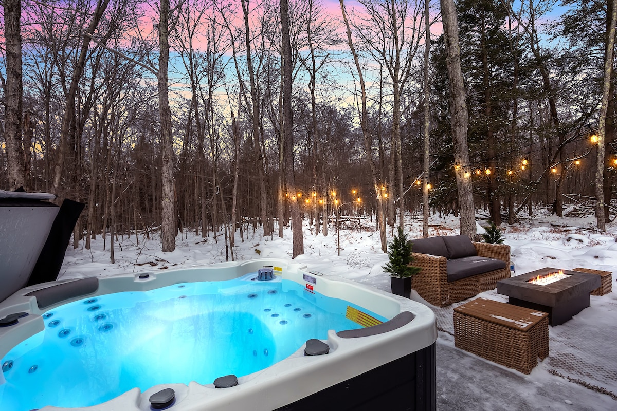 Ask about Spring weekday specials! 🌸 This spacious tiny retreat is fully stocked for a memorable family vacation or a romantic couple’s getaway. Soak in your private hot tub, toast s’mores by the fire, sway in the hammock under the stars, or stay in and enjoy hours of gaming on our new Nintendo Wii. Enjoy access to 2 beaches, an Olympic-sized pool (seasonal) mini golf, tennis courts & more. Just minutes from Pocono favorites like skiing, casinos, and waterparks.