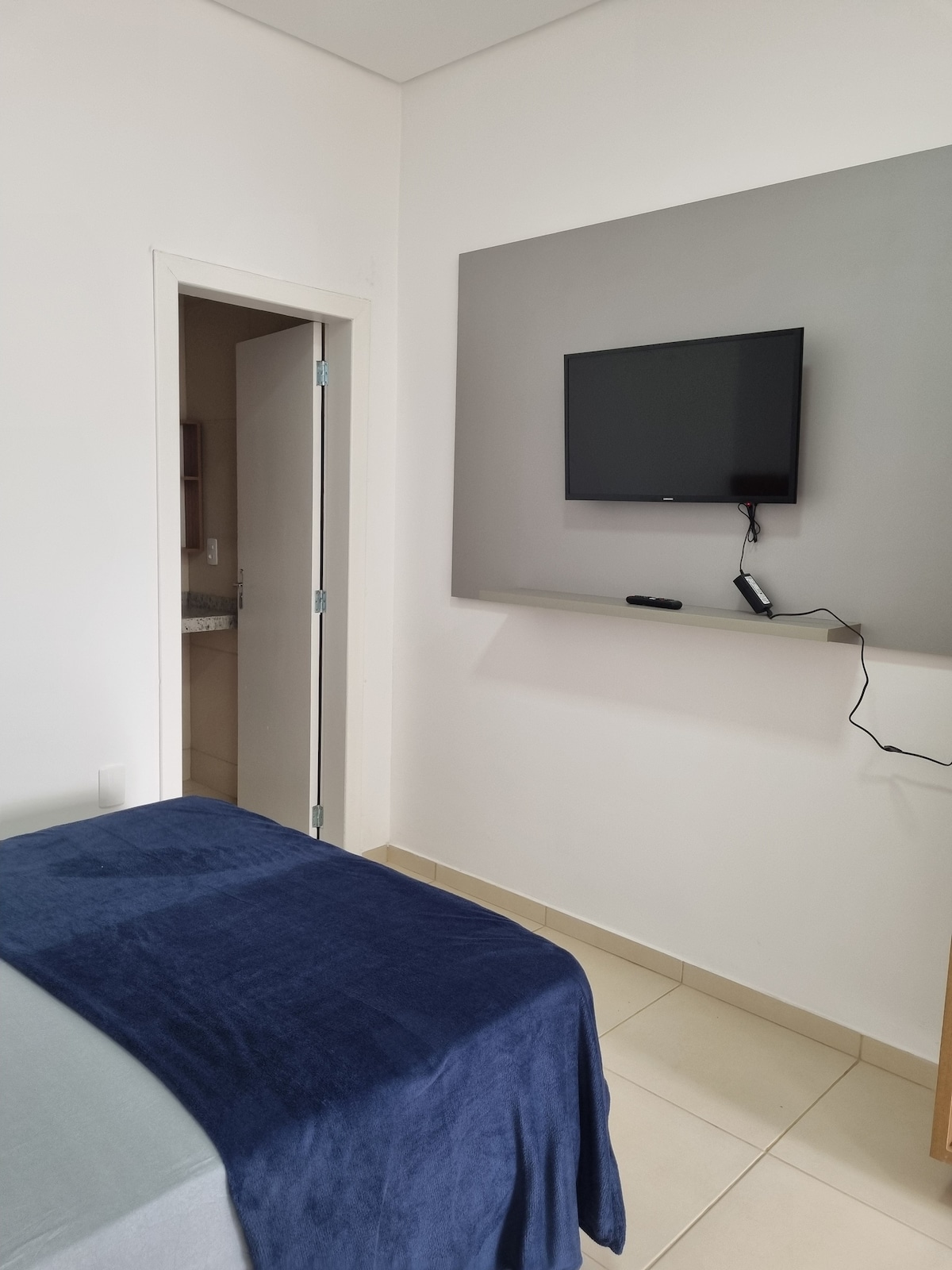 O quarto aconchegante é ideal para pernoite de ate 3 hóspede, oferecendo ar condicionado, uma cama de casal e uma cama de solteiro acomoda ate 3 hospedes , TV, banheiro completo, mesa, pia de mármore,armário,Wi-Fi e uma vaga de garagem nao coberta.