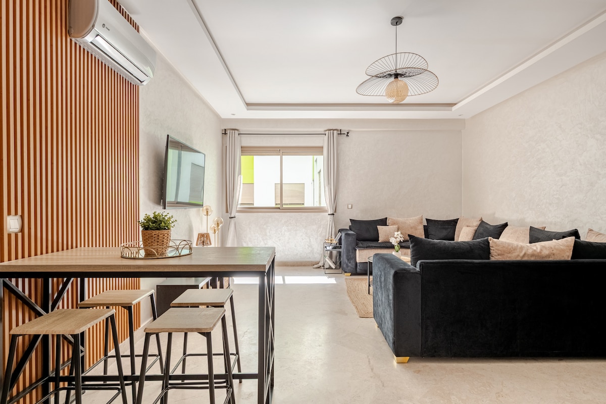 Discover our luxury apartment in Bouznika Costabeach, perfect for families or business travelers. This modern 2-bedroom home features an elegant living room with three TVs, fiber optic Wi-Fi, a workspace, and a fully-equipped kitchen. Enjoy the two terraces, air conditioning and amenities of the residence with pool, parking and 24-hour security. A short walk to the beach and local attractions. Book for an exceptional stay!