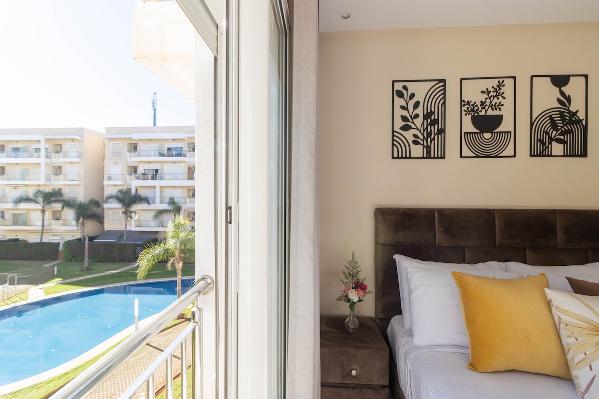 - Emplacement idéal : Entre Casablanca et Rabat, à 5 minute de la plage et 10-min de la gare. - Espaces modernes : Salon confortable avec TV, 2 chambres (1x lit double et 2x lits jumeaux) et cuisine bien équipée. - Vue agréable : Balcon privé donnant sur une piscine, parfaite pour se détendre. - Commodités : Accès à la piscine commune, Wi-Fi gratuit 200 Mbps et parking sécurisé. - Résidence calme : Sécurisée 24h/24 pour un séjour en toute tranquillité.
