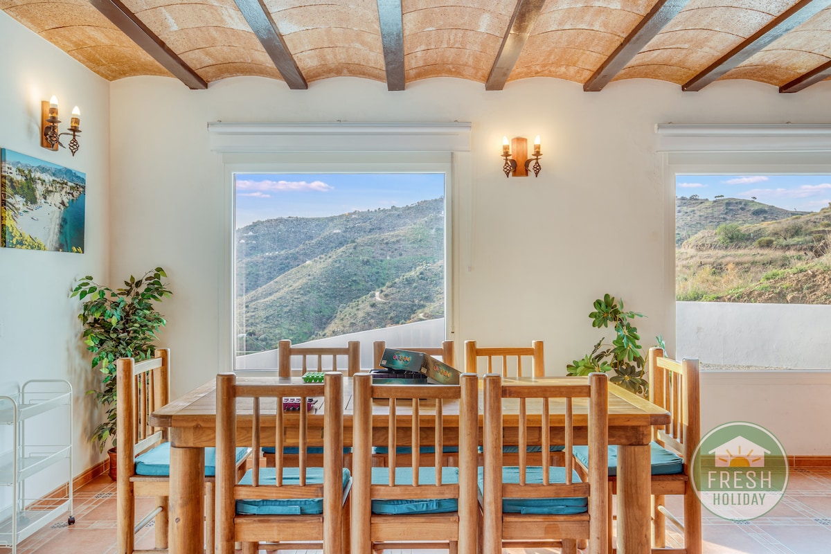 Gezellig familiehuis voor 2 gezinnen of 1 grote familie (8 personen + 2 babybedjes) met privé infinity pool (9x4m), verwarmd vanaf april t.e.m. oktober door middel van zonnepanelen. Prachtig uitzicht op de vallei van Vélez-Málaga en de Middellandse zee. Ideaal vakantiehuis voor wie houdt van een unieke locatie, zeezicht, natuur, prachtige zonsondergangen en sterrenhemels, en bovenal rust.