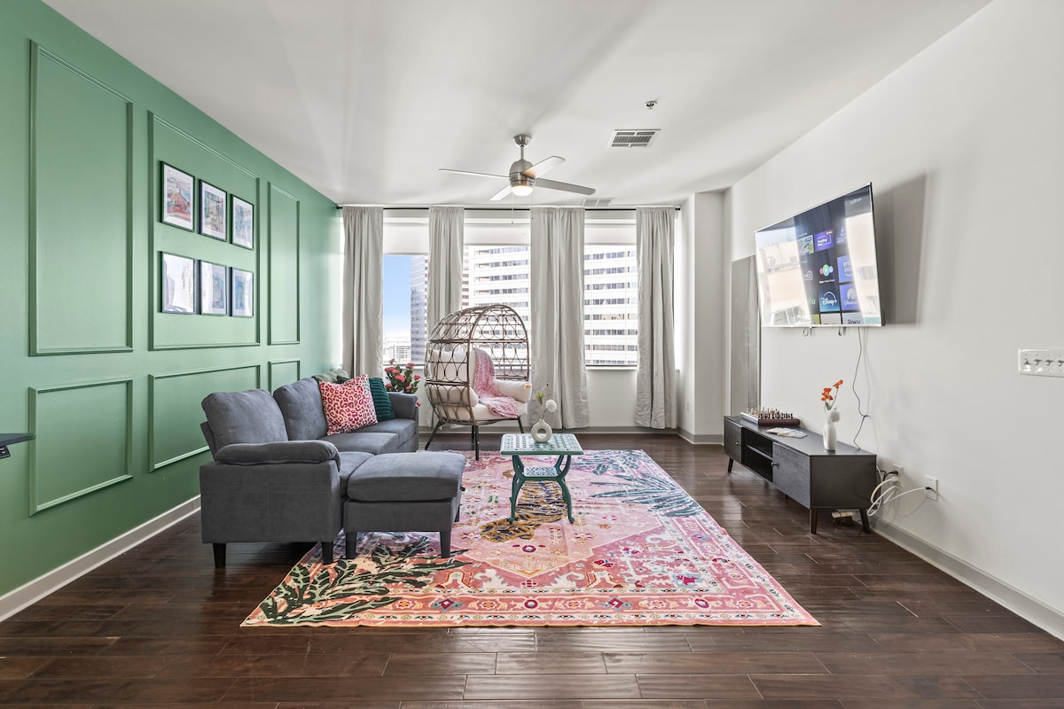 Enjoy a stylish experience with Downtown high-rise Views, close to all entertainment, restaurants, convention center, beauty centers, shopping areas and offices Public transportation, Uber/Lyft are highly available Access to gym, pool (may or may not be open)& outdoor spaces Balcony in the unit where you can enjoy yourself at any time of the day Free parking in the building