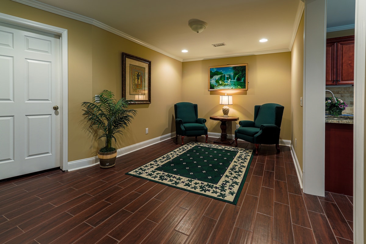 NO CLEANING FEE - Although we don't charge a cleaning fee, our cleaners work very hard to provide a clean place for our guests. THIS IS NOT AN ENTIRE HOUSE. This is a terrace-level guest SUITE in a home in a nice neighborhood with many high end homes. Very safe and quiet location with no thru traffic. The guest suite is private to you with your own private entrance. Access does not include the rest of the house. FREE PARKING on your own reserved spot! NO PARTY policy enforced! (read below)