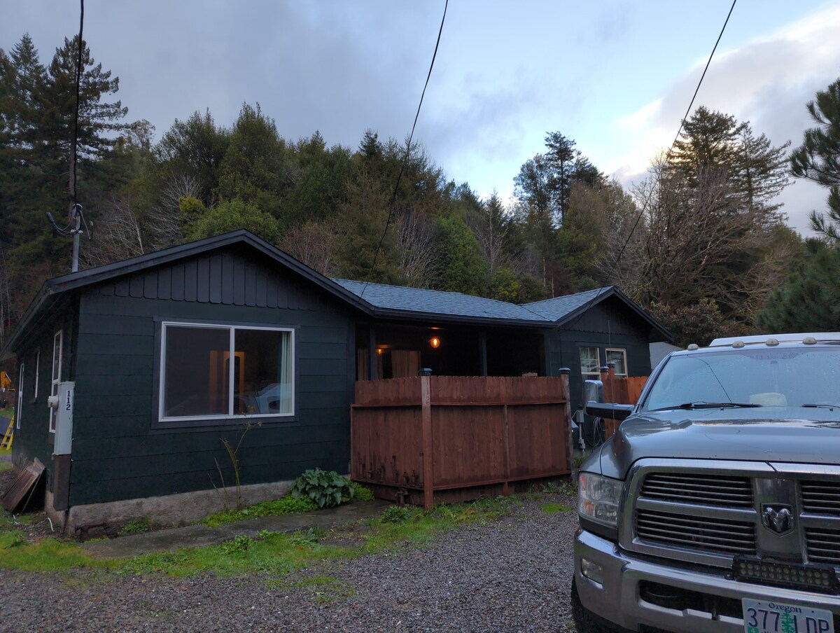 Nestled in the Heart of the Redwoods. Gather together at the front porch bar while your honey is BBQing just below and your family/friends are enjoying the Hot Tub just off to the side. Not far from 101 but yet secluded. Through the seasons you may see ospreys, bald eagles, quail, bear, possibly a mountain lion, maybe a skunk, or other wildlife. Also, know winters and sometimes spring and fall can bring high winds, floods and power outages.