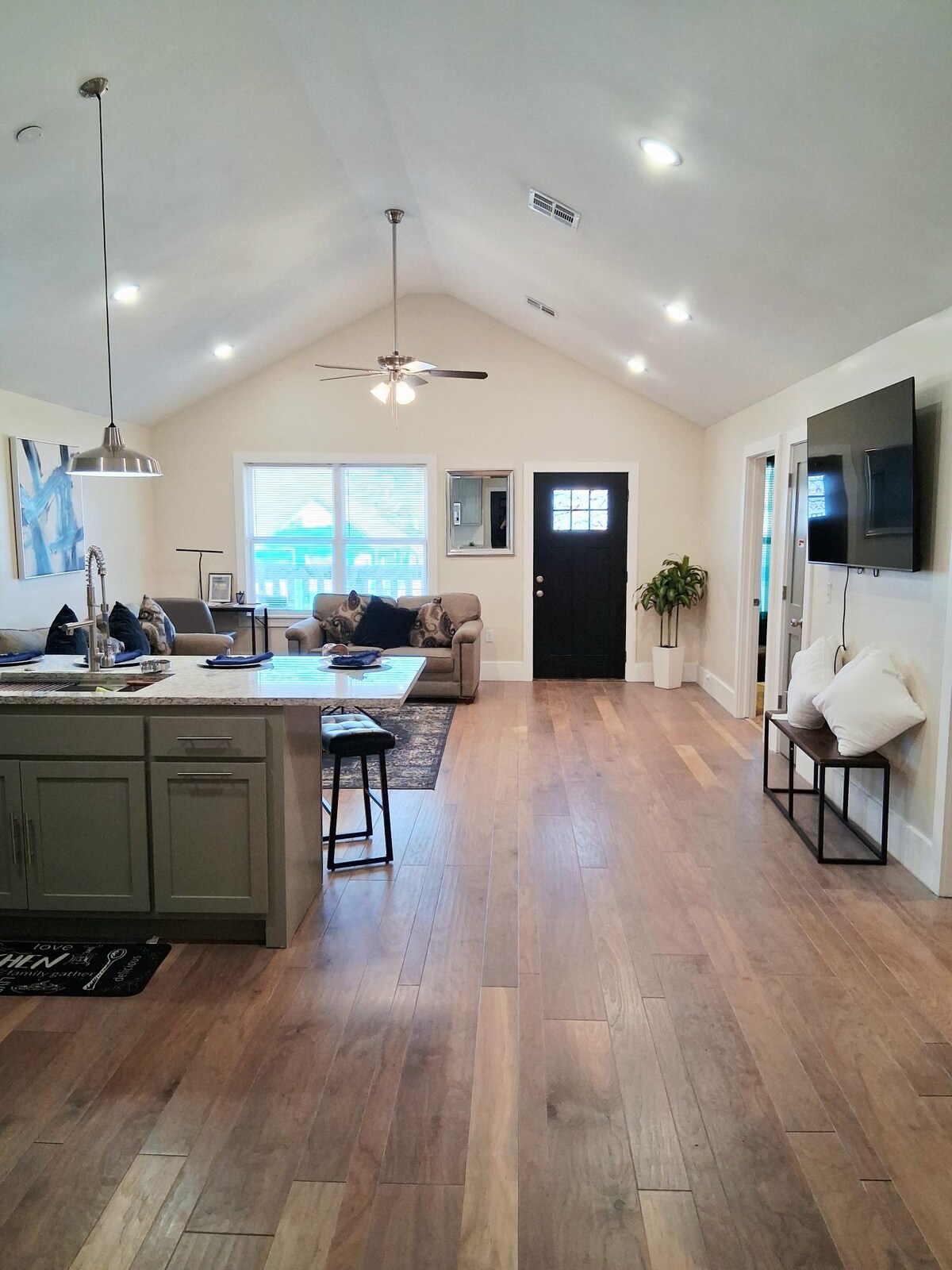 A few houses from Midtown’s pickle ball courts, you’ll find the Ivy Cottage. Charm and character are the highlight of this adorable property. The oversized sectional is the perfect place to cozy up and watch your favorite show on the Smart TV. Or serve dinner in the dining room with French doors that open to the patio. In the back you’ll find a hot tub, smart TV, couch, dart board, wine fridge, cornhole, etc. Plush beds await when you’re ready to call it a night. *Fireplace is not working.