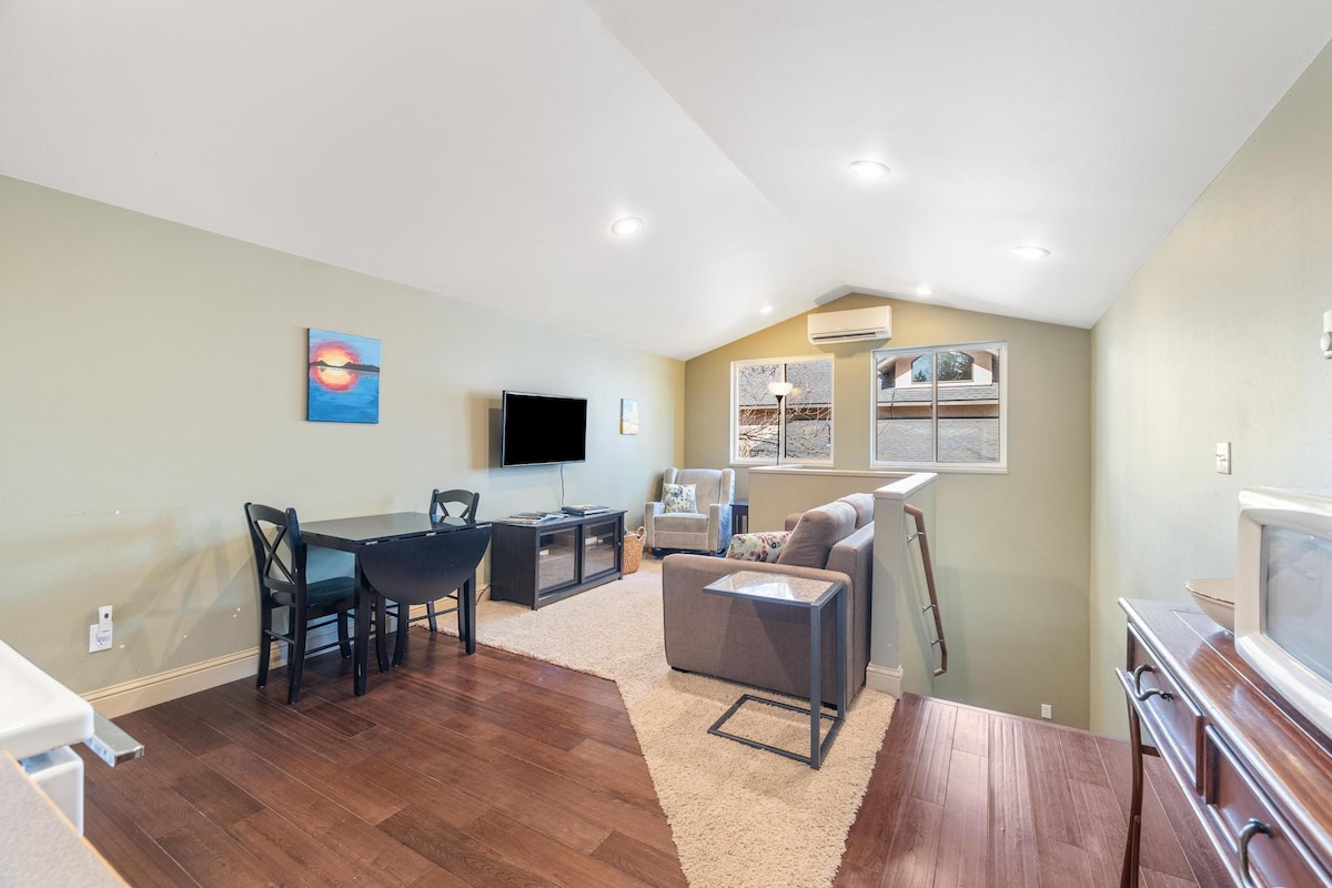 Studio 7B is a street-level former art studio (gentle memories on concrete floor & paintings!) now a unique comfy 400+ sq ft suite, in a large bldg, on a landscaped commercial spot! We live above :) Please rd property desc. , too 1blk to free public transit & bike paths >10 mins to beach, dining, hiking, downtown, shopping, skiing, etc SEPARATE: entry, patio, parking SUITE: elec. fireplace, wifi, livingrm, dining, bdrm, bathrm There's a working studio beside & live music can be heard