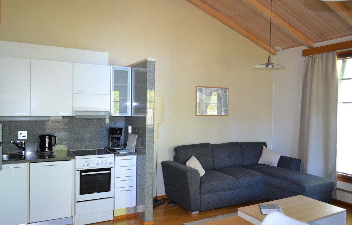 The chalet has 2 bedrooms and a living room combined with a kitchen, a terrace with furniture for relaxation. Smoking is allowed only on the terrace, no smoking in the house. The kitchen has everything you need for cooking - stove, oven, microwave, kettle, toaster, coffee maker, fridge, as well as a full set of dishes, dishwasher and washing machine. Firewood is provided for the fireplace. There is a sauna and a clothes drying cabinet. Bed linen can be brought with you or rented. The cost is 12 euros per person.