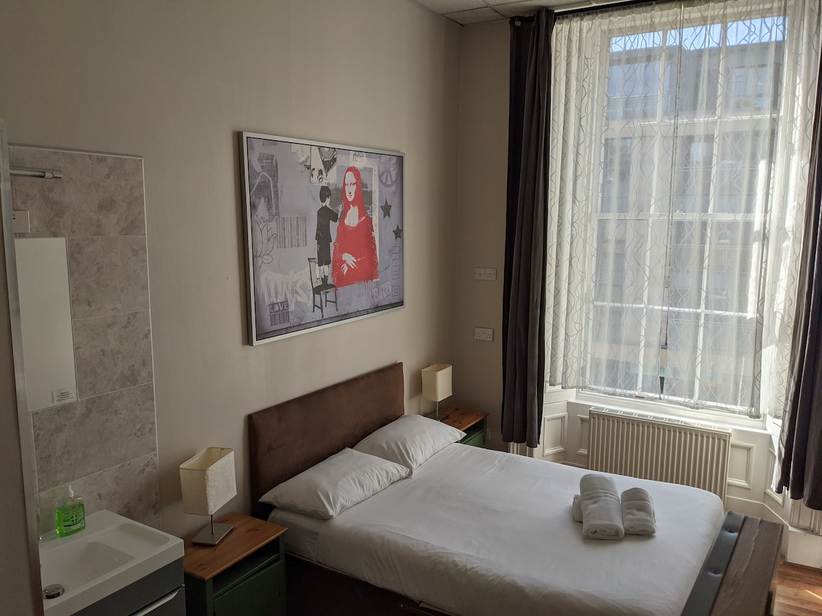 King Sized bedroom with own en suite bathroom in a beautiful Georgian four storey town house on a picturesque garden square in the UNESCO World Heritage New Town. This freshly renovated basement flat has its own private front door. The house is in the Stockbridge area of Edinburgh, close to the city centre, minutes away from fabulous artisan cafes, fantastic restaurants, delis, bars, independent shops and galleries. Across the square is Glenogle Baths with a gym, sauna and swimming pool.