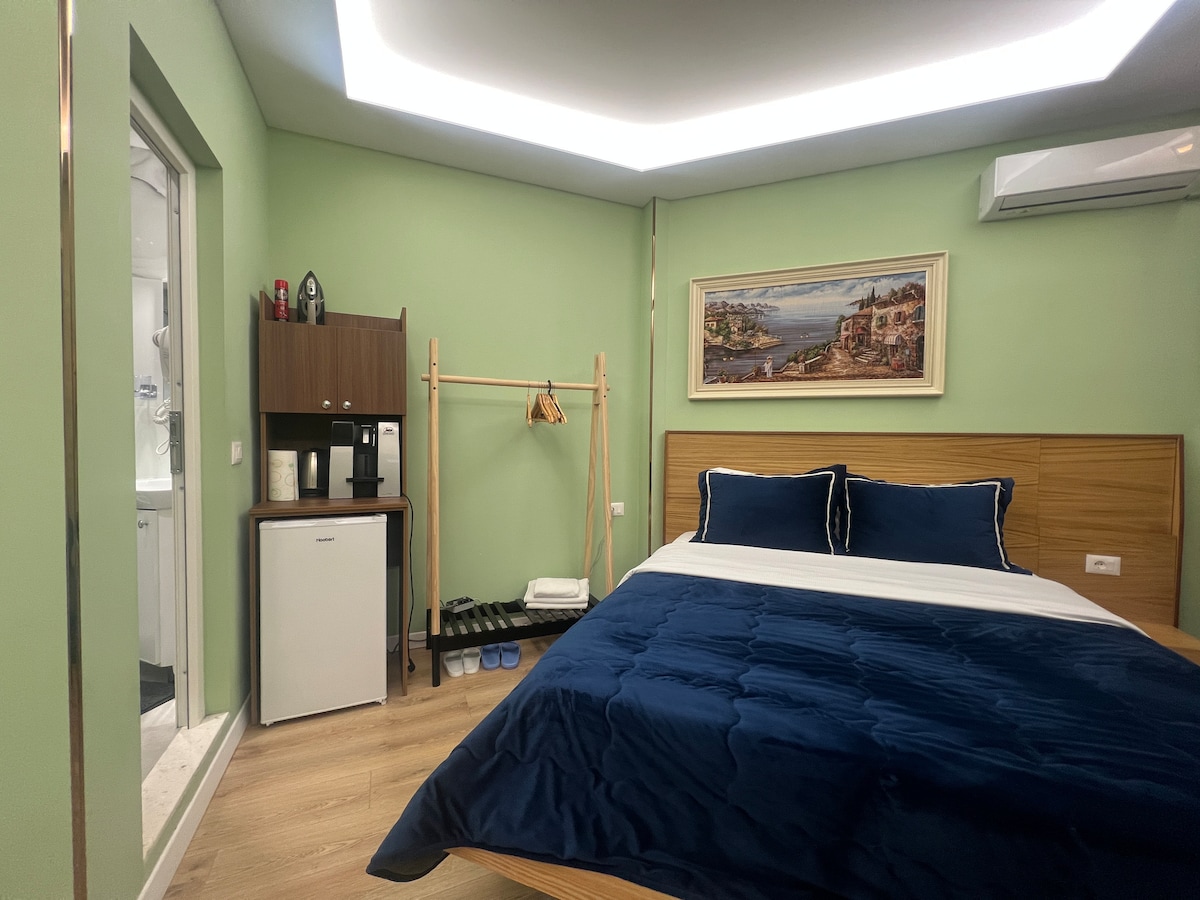 Perfect for couples or solo travelers, this room offers a blend of comfort, style, and city charm. Extra-large king-size bed with premium bedding Private balcony overlooking the city – ideal for morning coffee or evening relaxation Air conditioning for your comfort Flat-screen TV with satellite channels Fast Wi-Fi for work or streaming Modern private bathroom with shower, fresh towels, and toiletries Tea/coffee maker and minibar