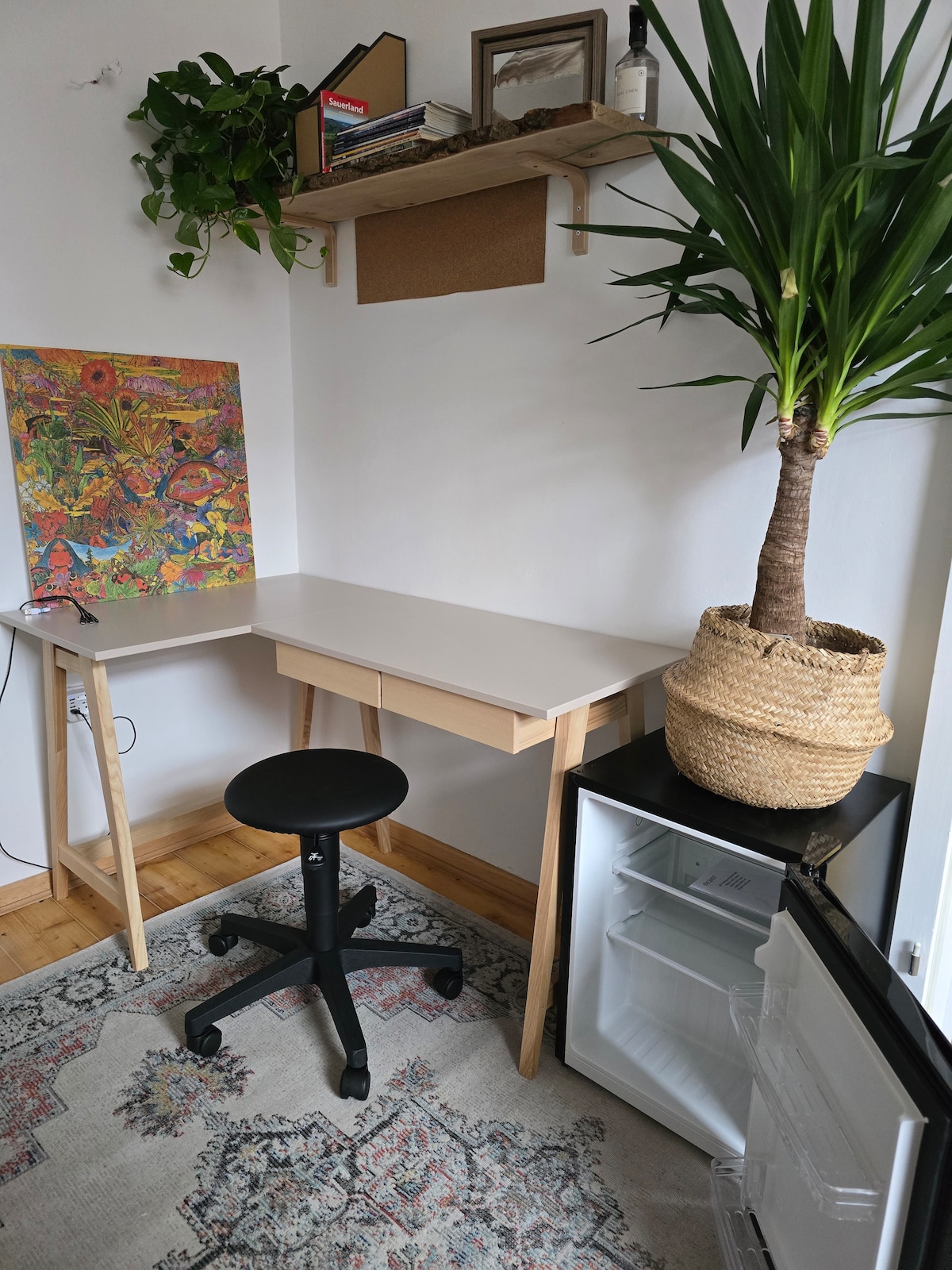 You can rent the apartment in our detached house for yourself. This is where we connected a new router. Now there is the latest WLan technology WIFI 6. The 50sqm with a south-facing balcony are equipped with a mobile air conditioning. The house is situated in a quiet dead end street. A separate bedroom with a box spring bed (1.40X2m) and walk-in wardrobe. In the bathroom you will find a nice walk-in shower and a washing machine. The kitchen is fully equipped.