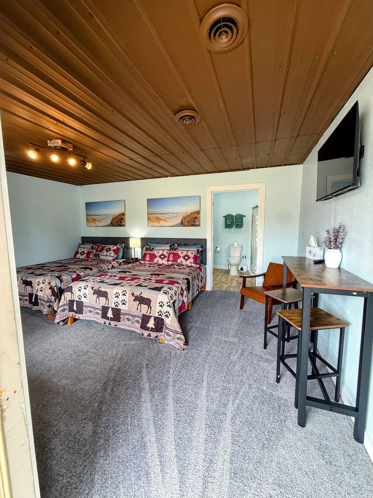 Welcome to Unit #3, a warm retreat in our newly restored roadside motel, Peninsula Point Lodge. Designed with a log-cabin charm on the outside & modern comfort within. Situated at the edge of the Hiawatha National Forest. Brand-new king mattress, a newly renovated bathroom, heat & A/C, WiFi, Smart TV for easy streaming. Whether you’re relaxing after a day of adventure or seeking a peaceful forest escape, Unit #3 offers the perfect blend of rustic ambiance and modern convenience.