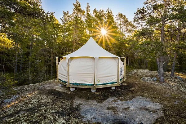 Pure nature! Kalliokumpu EcoLodge glamping tent (for 2 people/max. 4) is located on our 4500 m2 natural rocky private property, surrounded by the magical archipelago forest. Cosy, luxurious 20 m² LotusBelle tent in Scandinavian design. Terrace, wood stove, queen bed, eco toilet & outdoor forest shower. Towels, bed linen & final cleaning including. Homemade breakfast (15 € p.p.). Privat Sauna possible for a fee (40 €/2 hours). Rental bike (20 € p.p./ 1 day).