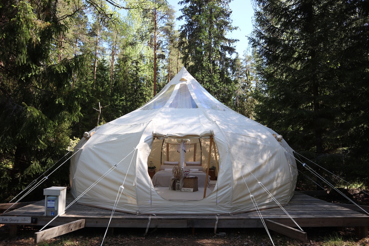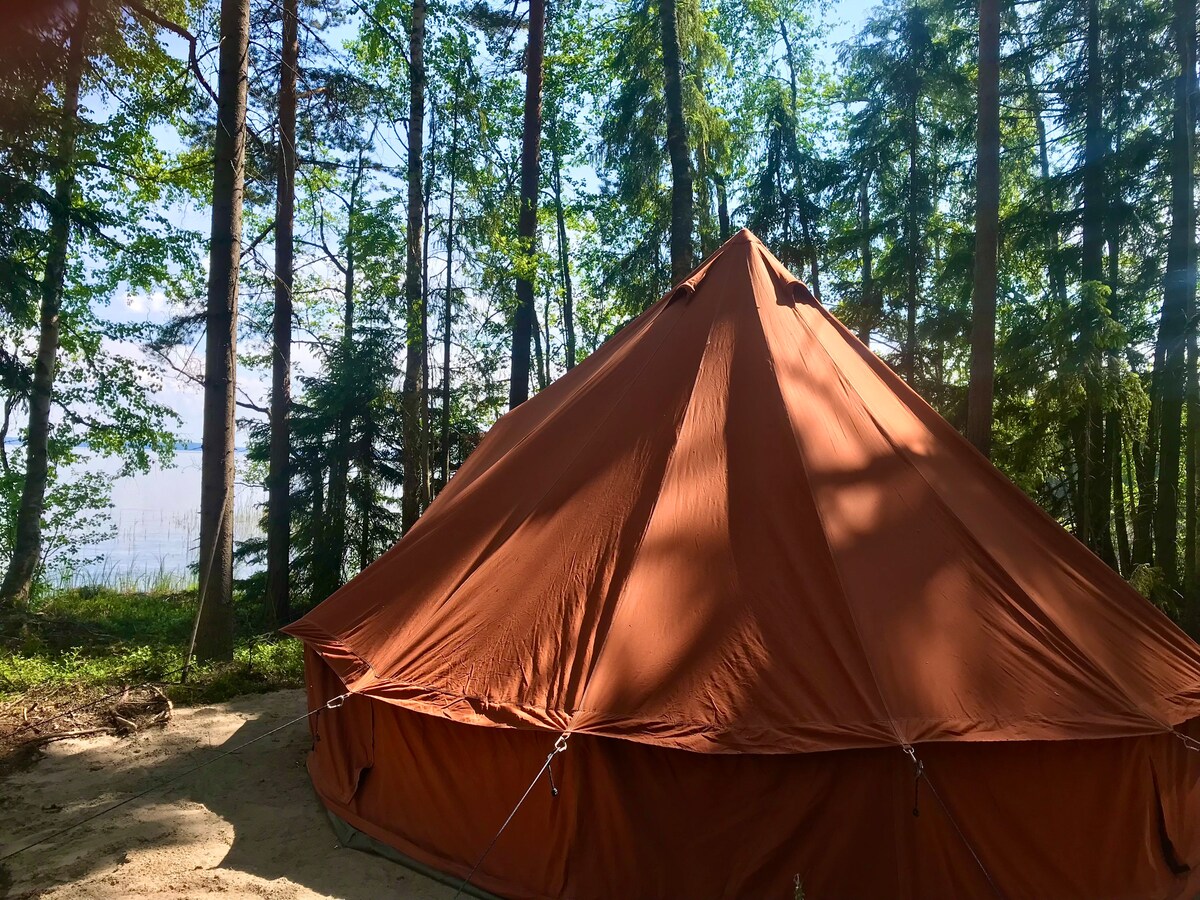 Off-grid glamping Spend the night in a spacious 36 m² bell tent on our quiet retreat site in Finnish nature. Equipped with 2 comfortable camp beds, extra blankets, mobile LED lights and WiFi on the premises. There are power points on the premises to charge your phone. Enjoy a wood-fired sauna (€10) or a sauna with a sauna session (€15), last round 8:30 p.m. Book a spiritual session and experience deep peace. Sleep masks are ready for the bright Finnish summer nights.