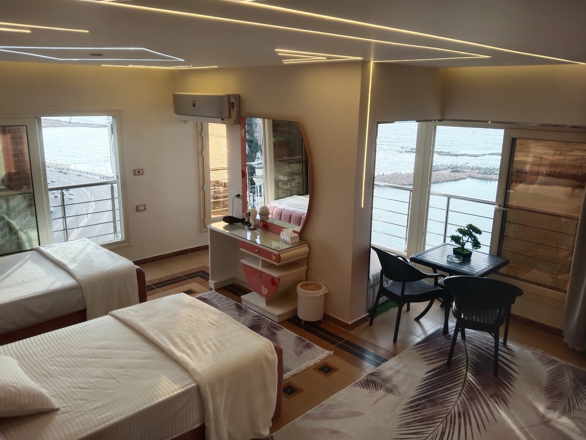 Your Luxurious Renovated 18th-Floor Mediterranean Getaway in Alexandria! 🌊🏖️ Imagine waking up to panoramic sea views from every corner of your apartment – even from your bed! Designed to maximize your sea experience, this spacious apartment is perfect for families. 3 Air condition bedrooms, each with two 120 cm beds. dining, Reception and living room offers breathtaking sea views to the west, North and East, perfect for enjoying the fresh, cool breeze, and ideal for soaking in the warm sun