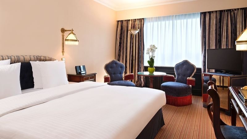 Hotel room with air conditioning, large flat screen tv, rain effect shower, espresso coffee machine, digital safe, free wi-fi, iron and ironing board, minibar, hairdryer and NH Collection bathroom amenities. Room size 23 m2.