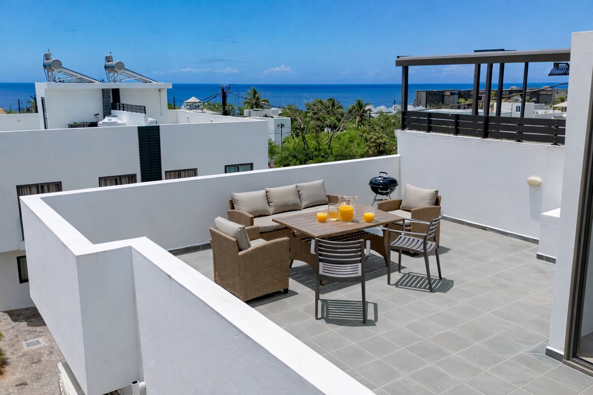 Soley Lor est une maison spacieuse dans une résidence privée, idéale pour les familles. Elle offre 3 chambres, 3 salles de bain, une cuisine équipée et un salon lumineux. Profitez de la piscine privée avec transats et d’un rooftop parfait pour admirer le coucher du soleil ou vous détendre. Située à 10 min en voiture de la plage et du centre de Flic en Flac, cette maison combine confort, intimité et moments inoubliables en famille.