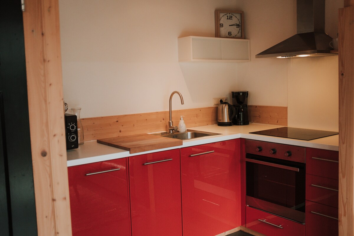 A compact tasteful sitting room dining area with beautiful views. A kitchenette with fridge induction plate Nespresso and microwave. Basic ingredients present (coffee tea pepper salt oil vinegar). Private toilet. At the rear terrace doors (also entrance) private garden (on SW) veranda and 2nd terrace (dining table, 2 sun loungers and gas BBQ). From the sitting room stairs to floor with bright luxurious bedroom king-size bed modern bathroom, shower and double sink. Very quiet and 1.5km from Domburg and beach!