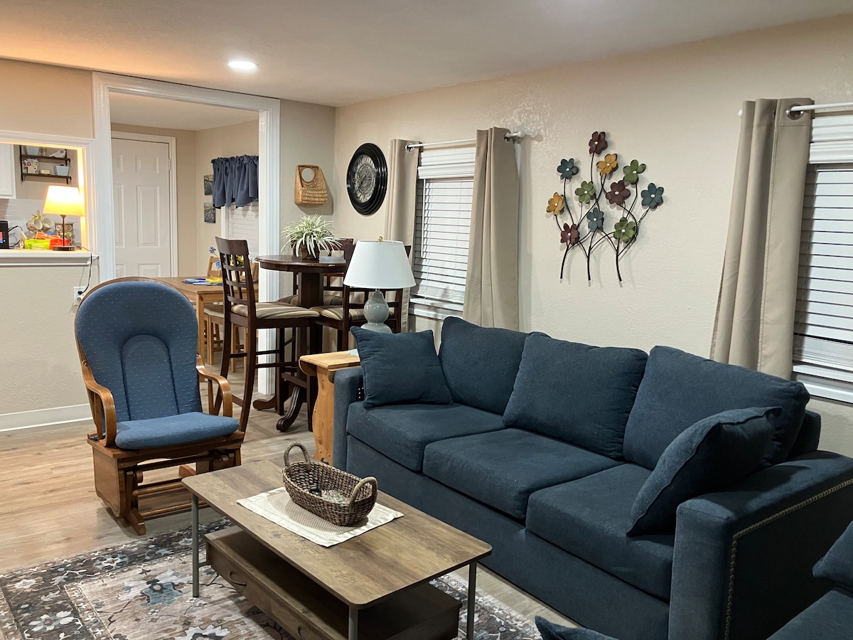 Feel at home in this spacious 700+ square-foot vibrant condominium that features a large living room which includes a plush sleeper sofa, this comes with a temperpedic mattress, flat 55 inch TV screen that swivels in any direction of living room or kitchen area to fit your needs when you are in the kitchen or relaxing on the comfy sofa. Wi-Fi, stainless steel appliances, excellent pots & pans for the chef at heart, gourmet beverages and a verity of wines, luxury linens and bathbomds/bath salts.
