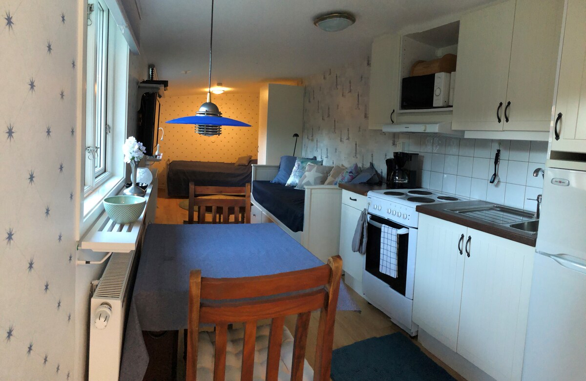 Welcome to Lotta & Bengt's easy overnight room! We offer a small simple room for overnight stay in bunk bed for two people. On a small surface there is a kitchenette, dining area and bunk bed. There is a fridge, microwave, coffee maker and kettle. Garden furniture is available at the entrance to the room. Private toilet. Access to shower and laundry room shared with host couple. Linen and shower towels (not beach towels) are included in the price. Close to sandy beach.